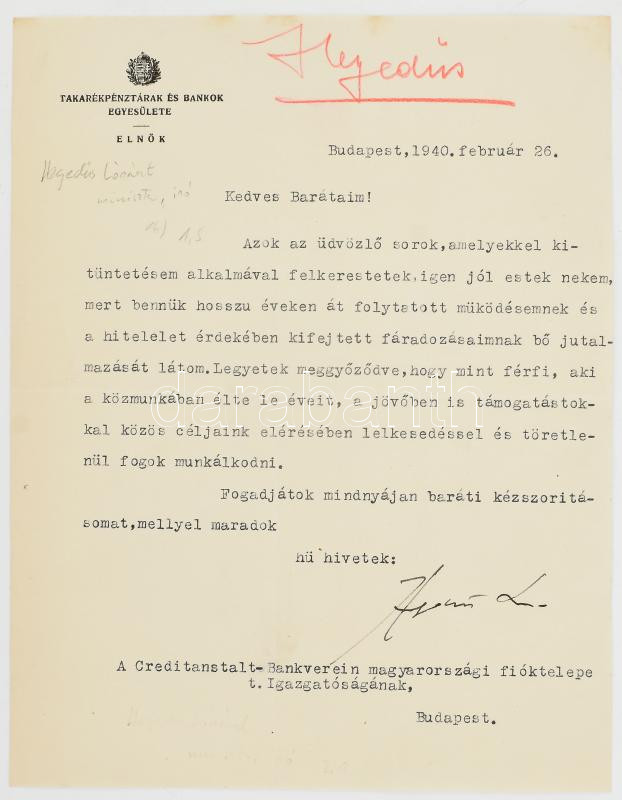1940 Bp., Hegedűs Lóránt miniszter által aláírt levél a Takarékpénztár... https://www.darabanth.com/de/472-Fernauktion/472.0/Kunst-Dokumente-andere-Sammelgebiete/Dokument~1000021/1940-Bp-Hegedus-Lorant-miniszter-altal-alairt-level-a-Takarekpenztarak-es-Bankok-EgyesC3~II3202295