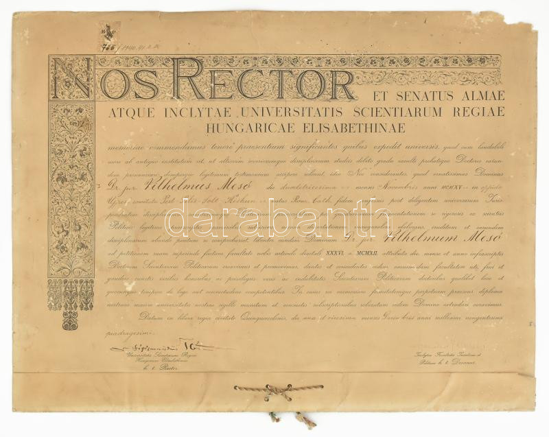 1940 Mesó Vilmos államtudományi diplomája. pergamen függőpecsét nélkül... https://www.darabanth.com/de/472-Fernauktion/472.0/Kunst-Dokumente-andere-Sammelgebiete/Dokument~1000021/1940-Meso-Vilmos-allamtudomanyi-diplomaja-pergamen-fuggopecset-nelkul-65x50-cm~II3080263