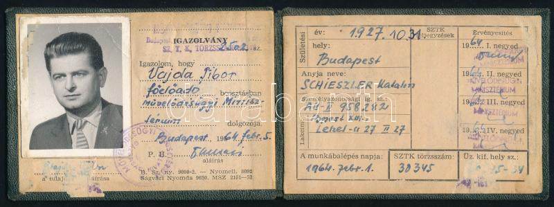 1964 Bp., Művelődési Minisztérium arcképes igazolványa https://www.darabanth.com/de/472-Fernauktion/472.0/Kunst-Dokumente-andere-Sammelgebiete/Dokument~1000021/1964-Bp-Muvelodesi-Miniszterium-arckepes-igazolvanya~II3200651