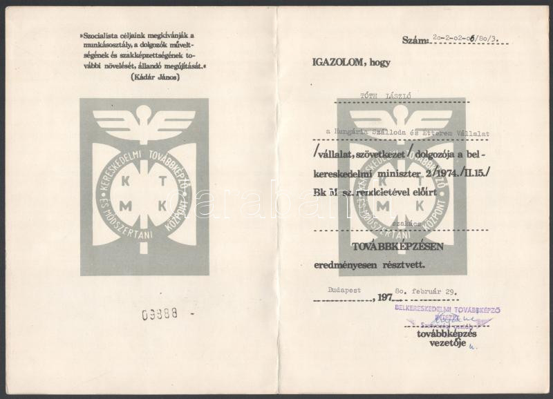 1980 Szakács továbbképzési oklevél (Hungária Szálló) https://www.darabanth.com/de/472-Fernauktion/472.0/Kunst-Dokumente-andere-Sammelgebiete/Dokument~1000021/1980-Szakacs-tovabbkepzesi-oklevel-Hungaria-Szallo~II3200732