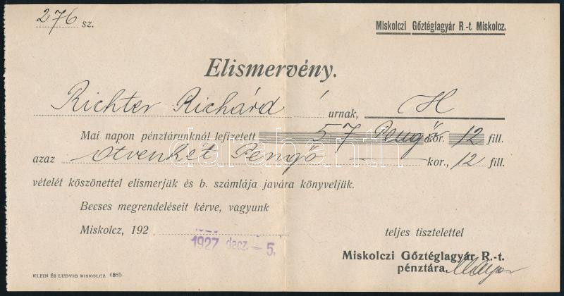 Beschreibung: Miskolc 1927 "Miskolczi Gőztéglagyár Részvénytársaság" elismervény