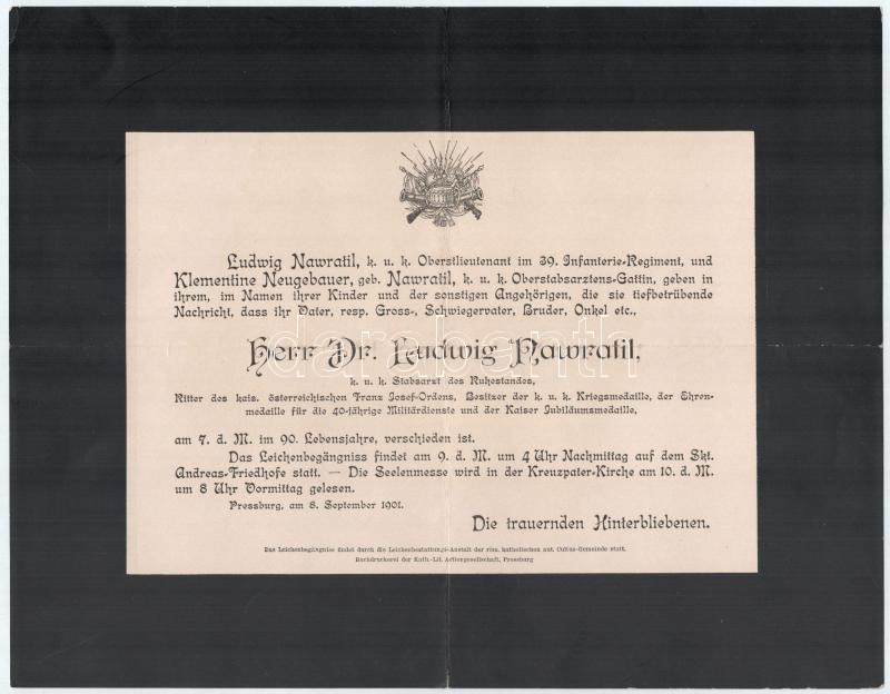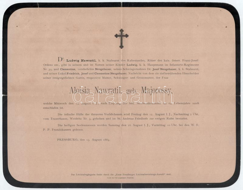 1884-1890, Nawratil család 3 prominens tagjának halotti értesítóje https://www.darabanth.com/de/472-Fernauktion/472.0/Kunst-Dokumente-andere-Sammelgebiete/Drucksachen~500013/1884-1890-Nawratil-csalad-3-prominens-tagjanak-halotti-ertesitoje~II3201709