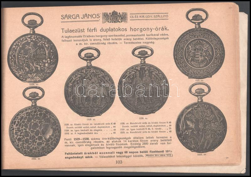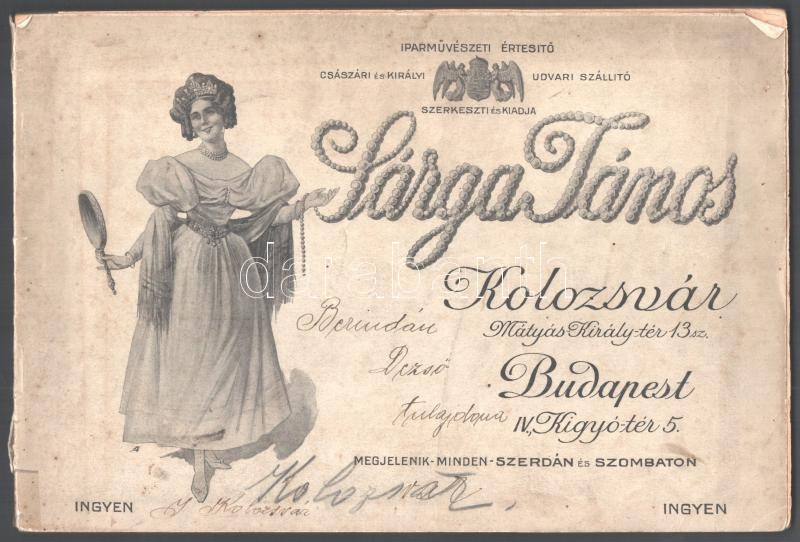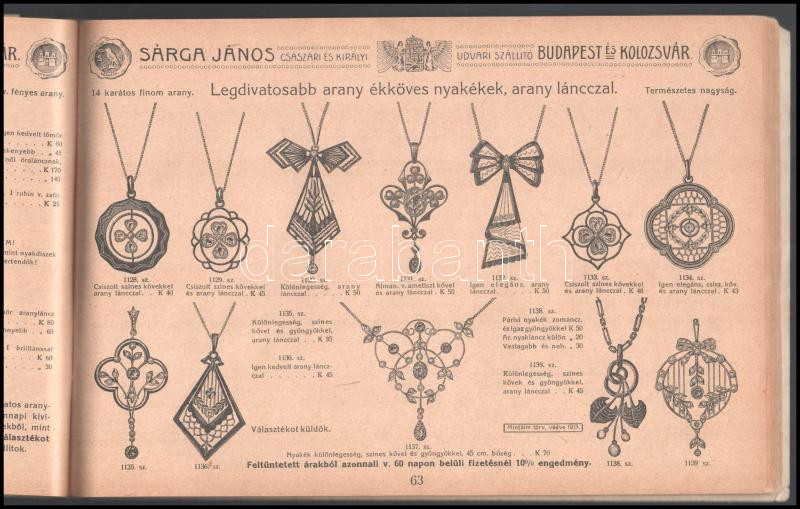 1907 Kolozsvár / Budapest, Sárga János császári és királyi udvari szállító üzletének árkatalógusa, illusztrált (órák, ékszerek, ezüst tárgyak), az üzlet belső terének képével, gerincnél szakadással, borítólapon tulajdonosi bejegyzéssel, 140p