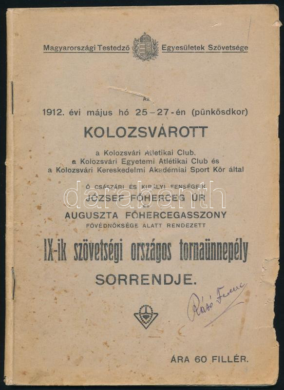 1912 Kolozsvár, országos tornaünnepély programfüzete 64p. kissé sérült... https://www.darabanth.com/de/472-Fernauktion/472.0/Kunst-Dokumente-andere-Sammelgebiete/Drucksachen~500013/1912-Kolozsvar-orszagos-tornaunnepely-programfuzete-64p-kisse-serult-boritoval~II3199282