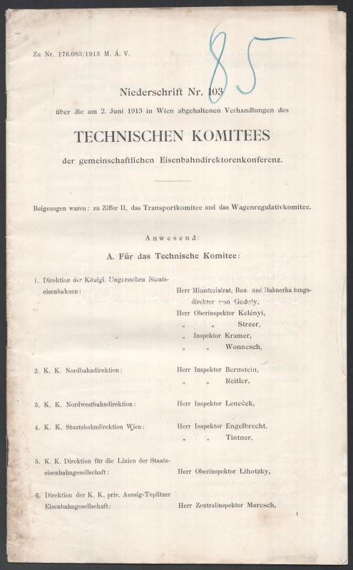 1913 Niederschrift Nr. 103 über die am 2. Juni 1913 in Wien abgehaltenen Verhandlungen des Technischen Komitees der gemeinschaftlichen Eisenbahndirektorenkonferenz. / Az 1913. jún. 2-án Bécsben tartott osztrák-magyar közös vasúti igazgatósági konferencia jegyzőkönyve. Bp., Hornyánszky-ny., 20 p.+ 3 (kihajtható) t. Német nyelven. Tűzött papírkötés, a címlap kissé foltos.