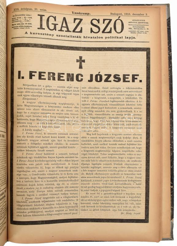 1916 Az Igaz szó c. keresztény szocialista politikai lap XIII. évfolya... https://www.darabanth.com/de/472-Fernauktion/472.0/Kunst-Dokumente-andere-Sammelgebiete/Drucksachen~500013/1916-Az-Igaz-szo-c-kereszteny-szocialista-politikai-lap-XIII-evfolyama-bekotve-Benne-Ferenc-J~II3147356
