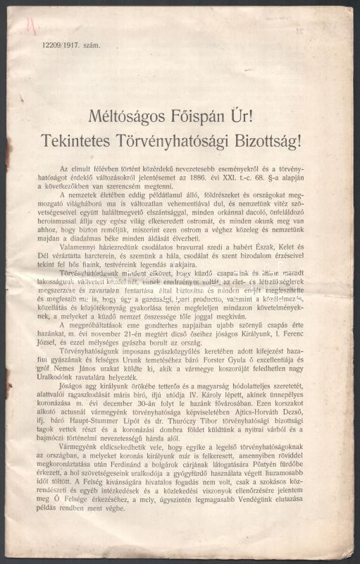 1917 Thuróczy Károly, Nyitra vármegye alispánjának jelentése 1916. második félévnek közérdekű eseményeiről, változásairól. (A vármegye pénzügyei, közbiztonsága, közegészségügye, stb.) Nyitra, Huszár István-ny., 24 p. Tűzött papírkötés, kissé foltos, néhány szamárfüles lappal.