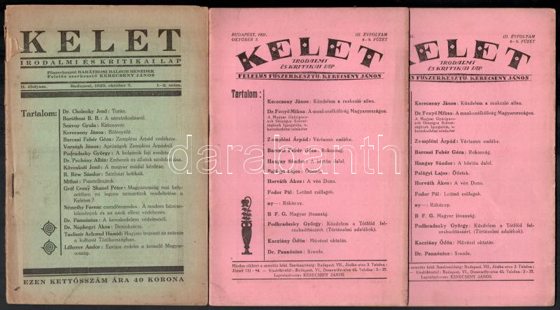 1920-1921 Kelet. Irodalmi és kritikai lap. Főszerk.: Baráthosi Balogh Benedek, Kerecseny János. II. évf. 1-2. sz. 1920. okt. 7., III. évf. 8-9. sz. (x2.) Az egyik borítója szakadt.