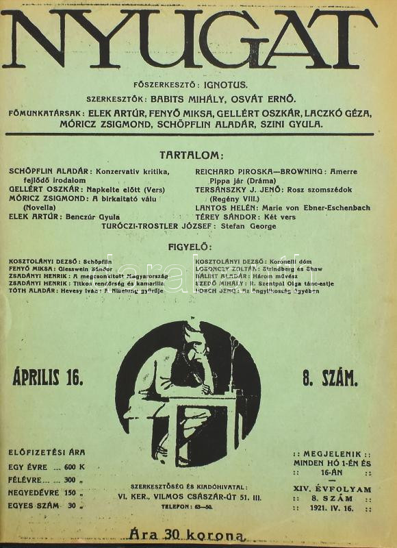 1921 A Nyugat XIV: évf. 8. és 12. szám. egybe kötve félvászon védőköté... https://www.darabanth.com/de/472-Fernauktion/472.0/Kunst-Dokumente-andere-Sammelgebiete/Drucksachen~500013/1921-A-Nyugat-XIV-evf-8-es-12-szam-egybe-kotve-felvaszon-vedokotesben~II3194382