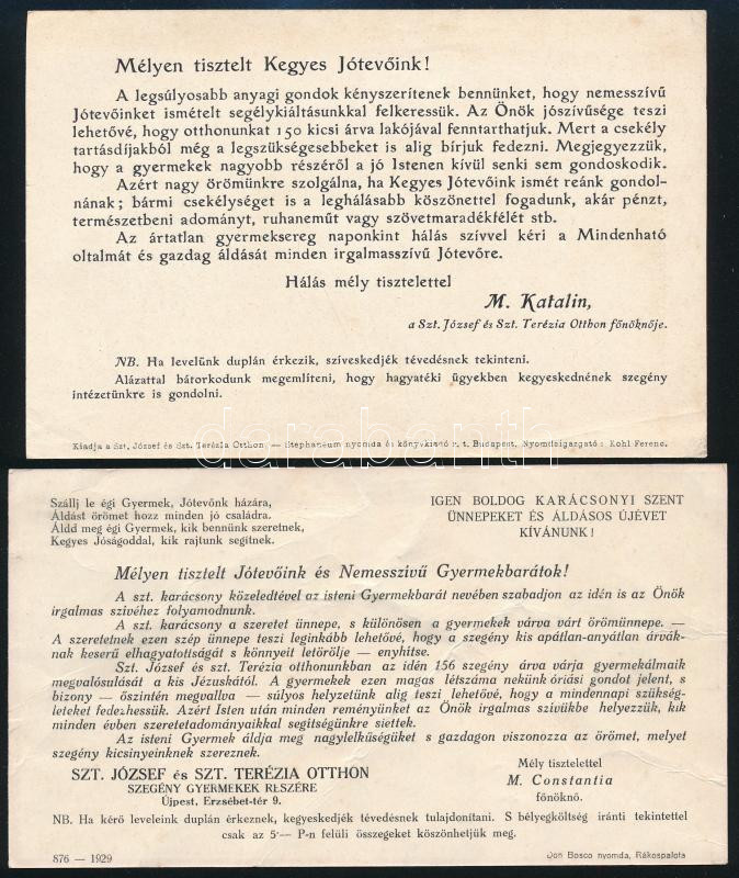 1930-1940 Újpest, Szt. József és Szt. Terézia Otthon 2 db lapja adomán... https://www.darabanth.com/de/472-Fernauktion/472.0/Kunst-Dokumente-andere-Sammelgebiete/Drucksachen~500013/1930-1940-Ujpest-Szt-Jozsef-es-Szt-Terezia-Otthon-2-db-lapja-adomanykero-felhivassal-gye~II3148654