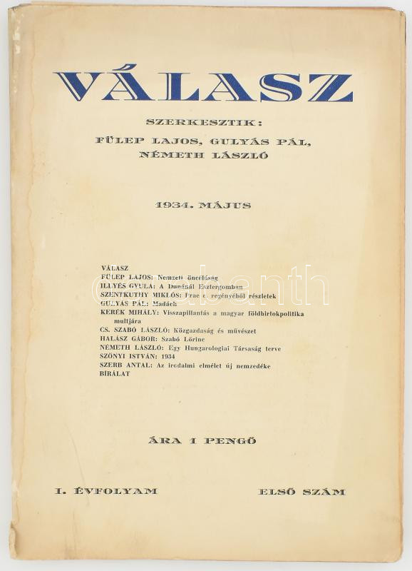 1934 Válasz. I évf., 1 szám. Szerk.: Fülep Lajos, Gulyás Pál, Németh László. Kecskemét, 1934, Első Kecskeméti Hirlapkiadó-, és Nyomda-Rt.,80 p. Benne prospektussal: "Meghívó egy uj magyar folyóirathoz." Kiadói papírkötés, a gerincen kis szakadással, foltos borítóval.