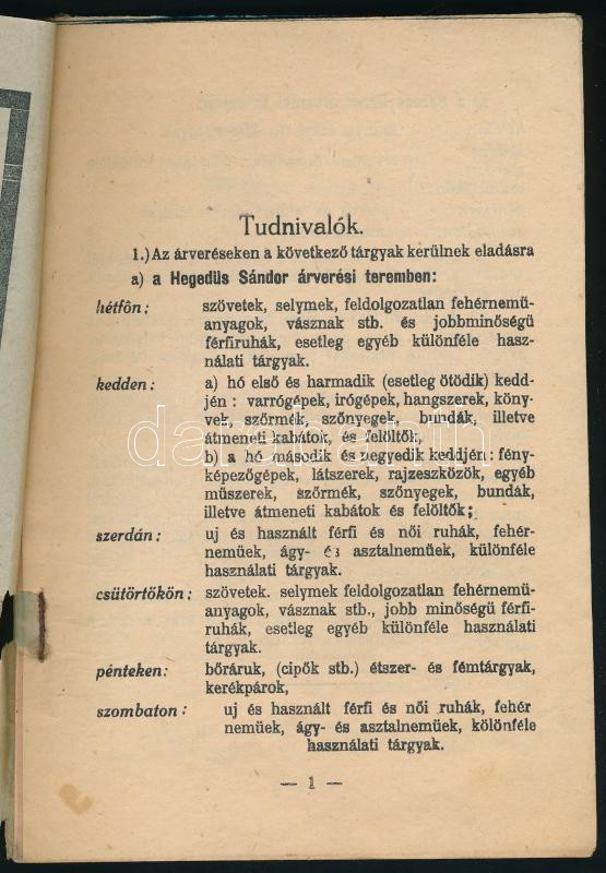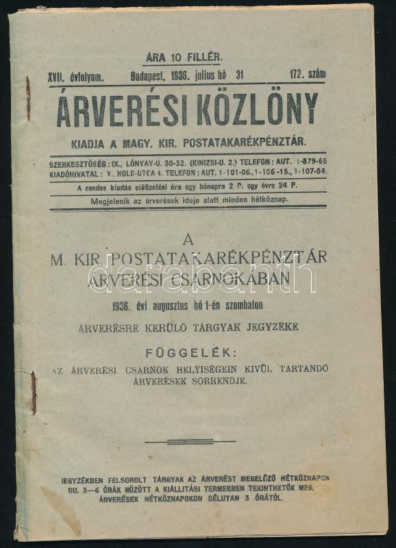 1936 Árverési Közlöny XVII. évf. 172. sz., 1936. júl. 31. A M. Kir. Postatakarékpénztár árverési csarnokában 1936. évi augusztus hó 1-én árverésre kerülő tárgyak jegyzéke. Függelék: az árverési csarnok helyiségein kívül tartandó árverések sorrendje. Bp., M. Kir. Postatakarékpénztár, 34+(4) p. Kiadói tűzött papírkötés, kissé viseltes borítóval.