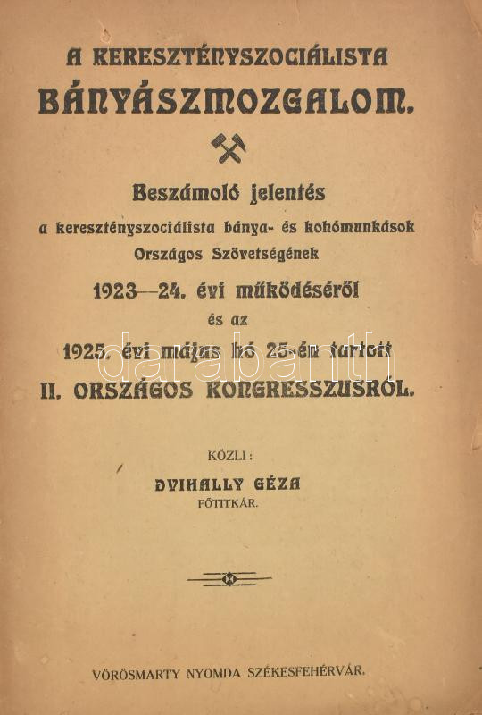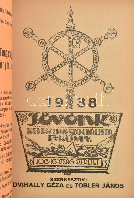 1937-1941 Jövőnk - Keresztényszociálista évkönyv egybekötve. Kiadói kopottas aranyozott egészvászon-kötésben. + Dvihally Géza: Beszámoló jelentés a keresztényszociálista bánya- és kohómunkások Országos Szövetségének 1923-24. évi működéséről és az 1925. évi május hó 25-én tartott II. Országos Kongresszusról. Sérült lapszélekkel.
