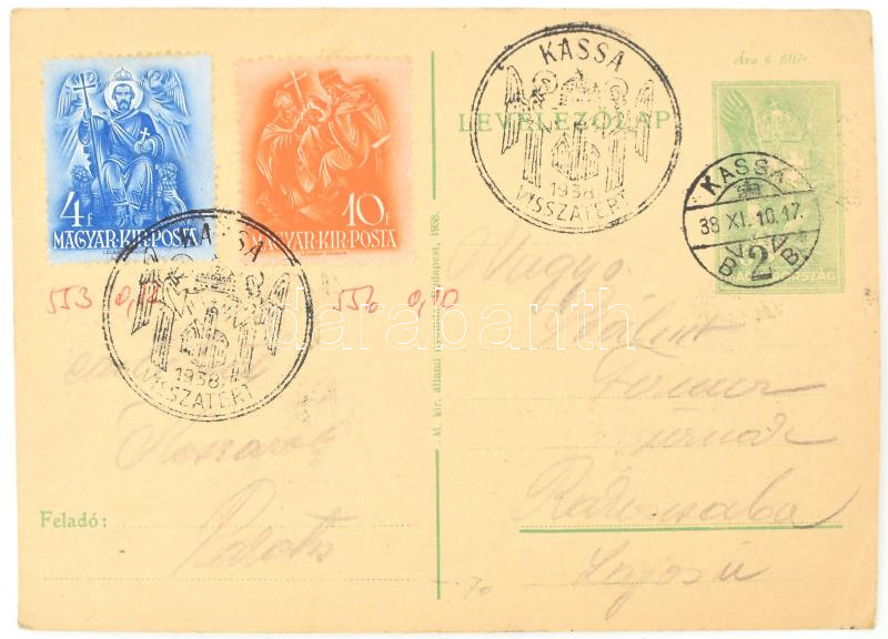 1938 Kassa visszatért bélyegzéses futott levelezőlap https://www.darabanth.com/de/472-Fernauktion/472.0/Kunst-Dokumente-andere-Sammelgebiete/Drucksachen~500013/1938-Kassa-visszatert-belyegzeses-futott-levelezolap~II3194518