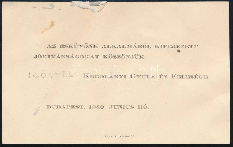 Beschreibung: 1940 Idősebb Kodolányi Gyula köszönőkártyája, kis sérüléssel