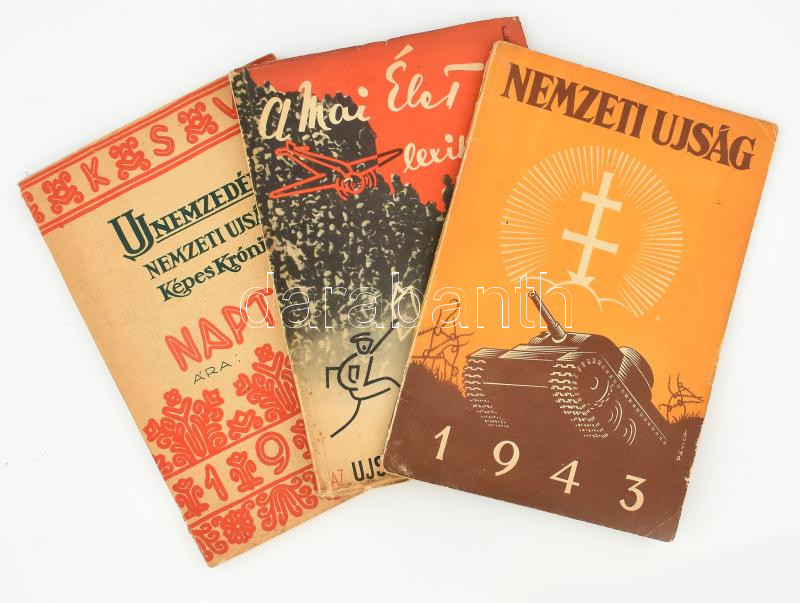 1941-1943 3 db évkönyv: Uj Nemzedék - A Központi Sajtóvállalat naptára 1941.; A mai élet lexikona. Mindent tudok - Az Ujság évkönyve 1941.; Nemzeti Ujság - A Központi Sajtóvállalat naptára 1943. Kiadói papírkötés, változó állapotban.