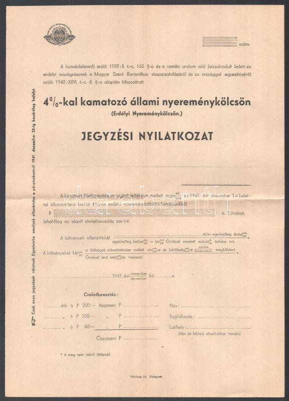 Beschreibung: 1941. "4%-kal kamatozó Állami Nyereménykölcsön (Erdélyi Nyereménykölcsön)" tájékoztatója és jegyzési nyilatkozata