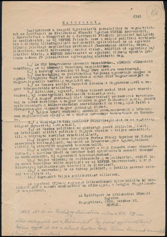 Beschreibung: 1956 Röplap a forradalom és szabadságharc napjaiból. Határozat, az Építőipari és Közlekedési Műszaki Egyetem nagygyűléséről okt 22.