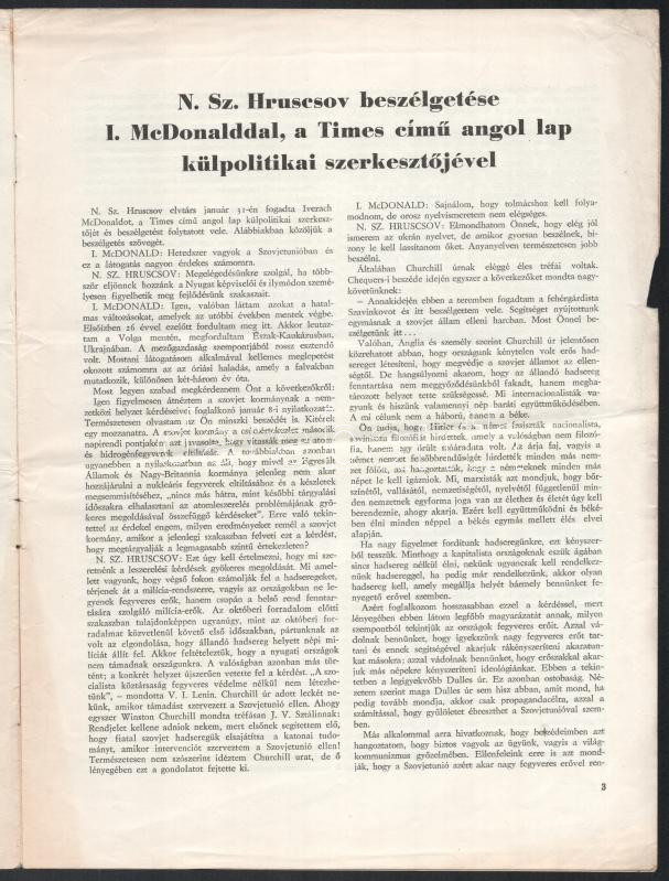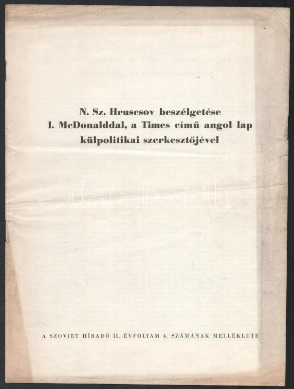 1958 N. Sz. Hruscsov beszélgetése I. McDonalddal, a Times című angol lap külpolitikai szerkesztőjével. A Szovjet Híradó II. évf. 4. számának melléklete. Tűzött papírkötés, kissé viseltes állapotban, 8 p.