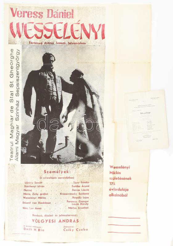 1971 Veress Dániel: Wesselényi (Gräfenbergi éjszakák), a sepsiszentgyörgyi Állami Magyar Színház országos bemutató előadásának műsorfüzete és plakátja. Wesselényi Miklós születésének 175. évfordulójára. A műsorfüzet utolsó 3 lapja szakadt. A plakát hajtott, a hajtások mentén szakadt, 95x60 cm. A mű