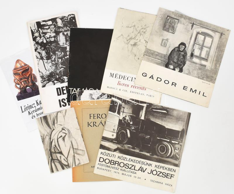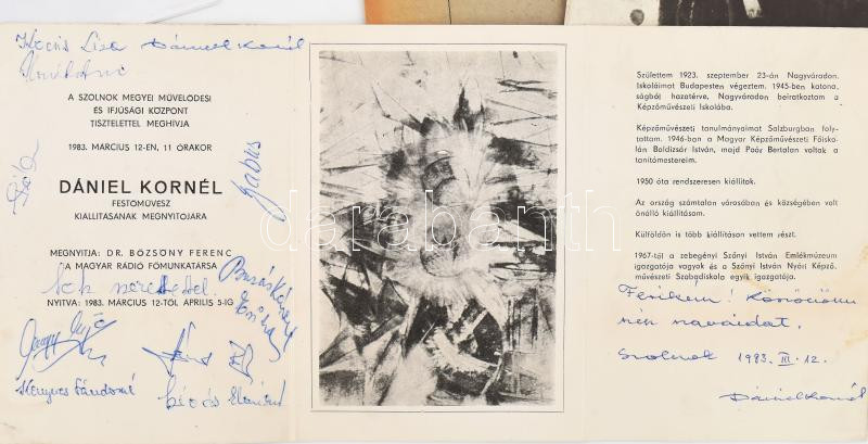 1983 Dániel Kornél festőművész kiállításának meghívója, benne a művész, Dániel Kornél (1923-2002) saját kezű aláírásával és dedikációjával, valamint további, azonosítandó aláírásokkal + 8 db vegyes művészeti prospektus