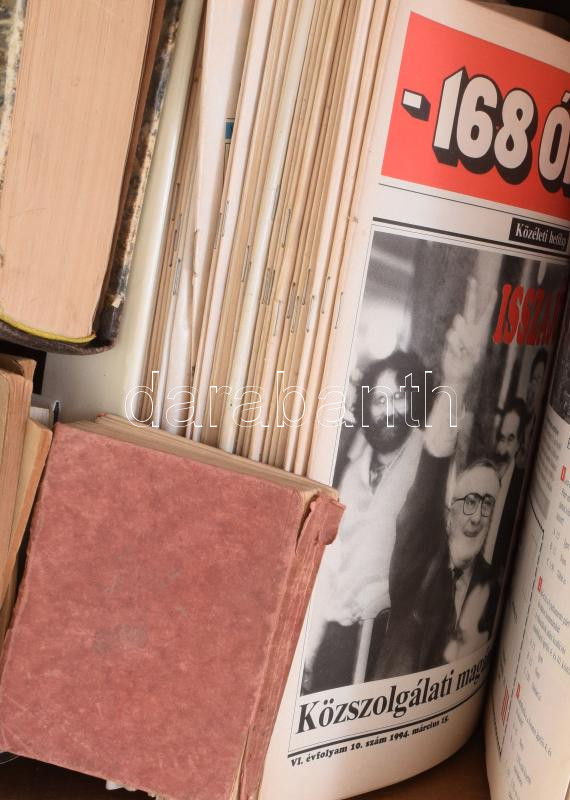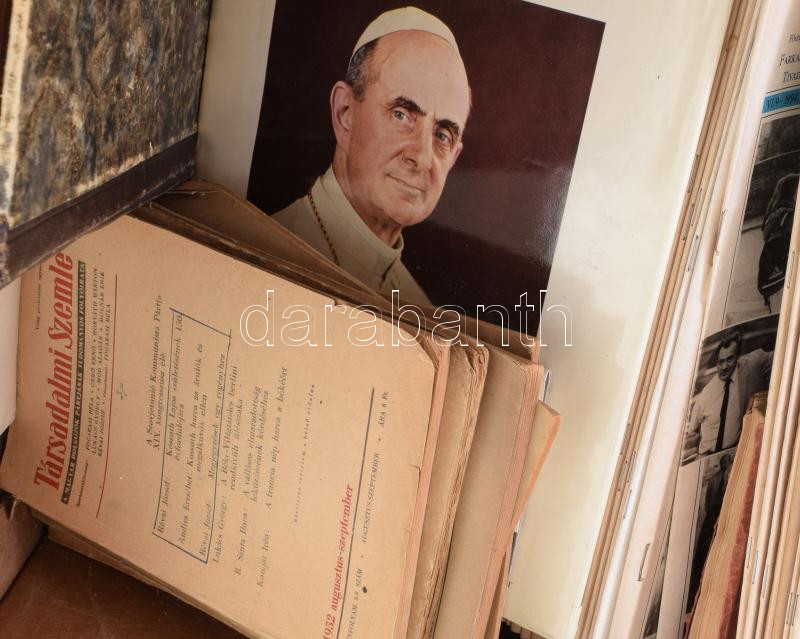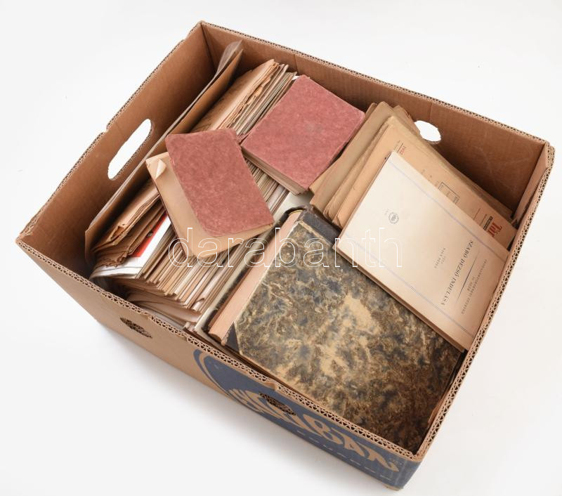 Beschreibung: Egy banános ládányi vegyes nyomtatvány és könyv: folyóiratok, benne Huszadik század, Forum, Társadalmi szemle, történelmi témájú könyvek.