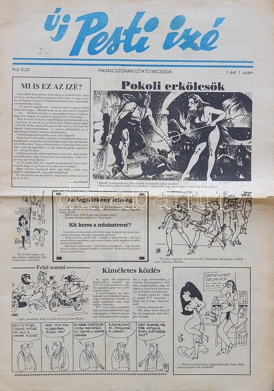 [Folyóirat] Új Pesti Izé. Pikáns szórakoztató micsoda. Főszerkesztő: Árkus József. Szerkeszti: Föld S. Péter. I. évfolyam, 1. szám. (Budapest), [1990]. Új Ludas Kft. (Egri Nyomda). 8 p. Folio. Árkus József képes szórakoztató hetilapja az 1946-1948 között megjelent, erotikába hajló szatirikus lap hagyományát újította meg. A számtalan karikaturistát felvonultató lapszám rövid cikkei és grafikái többnyire az erotika témájában mozognak, néhány, a rendszerváltás kulcsévét megjelenítő politikai kiszólással. A bemutatkozó cikket Árkus József írta, több rövid cikket Peterdi Pál. Sajdik Ferenc, Balázs-Piri Balázs, Brenner György, Dallos Jenő, Hegedüs István, Várnai György és mások grafikáival. Fűzés nélkül, félbehajtva.