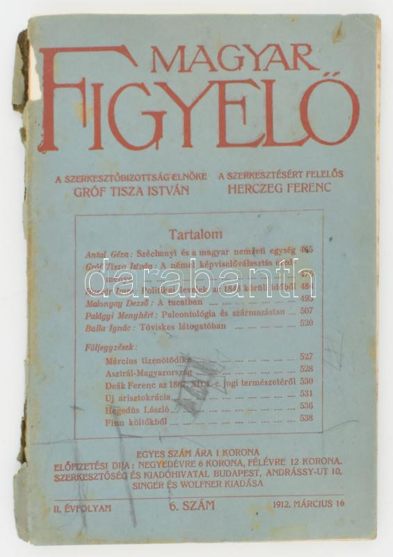 Magyar Figyelő 1912. március 16-i száma, II. évfolyam 6. szám. Foltos,... https://www.darabanth.com/de/472-Fernauktion/472.0/Kunst-Dokumente-andere-Sammelgebiete/Drucksachen~500013/Magyar-Figyelo-1912-marcius-16-i-szama-II-evfolyam-6-szam-Foltos-erosen-serult-papirk~II3198822