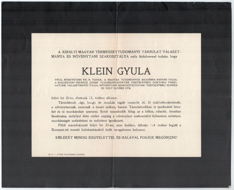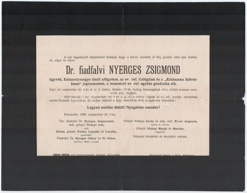 cca 1906, Dr. Fiadfalvi Nyerges Zsigmond Kolozsvármegye tiszti alügyésze és Klein Gyula Kolozsvári Ferencz József Tudomány-Egyetem tiszteletbeli doktora halotti értesítője, kis szakadással