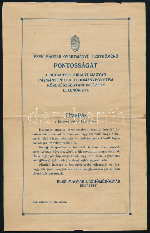 cca 1920-1940 Utasítás a hőmérő helyes kezelésére, Első Magyar Lázhőmérőgyár Bp., hátoldalán "Láztábla" (kitöltetlen), hajtott, kisebb szakadásokkal, 23,5x14,5 cm