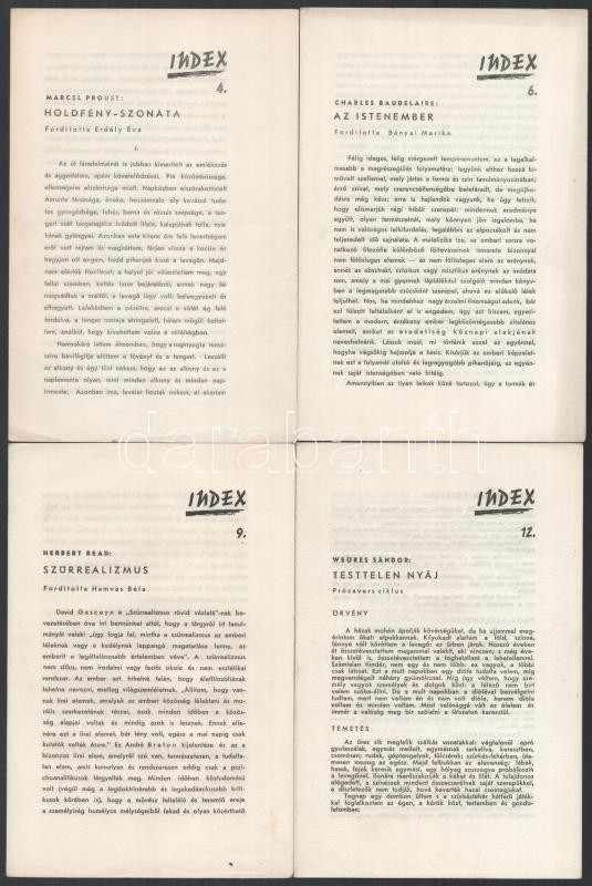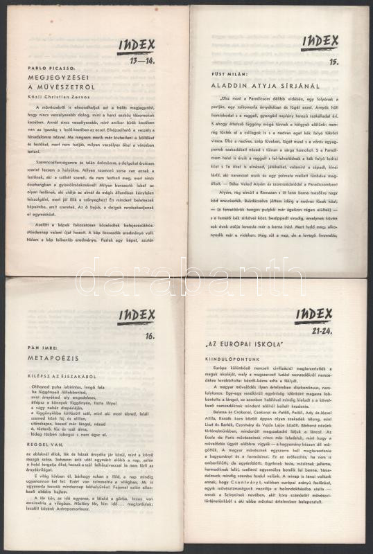 cca 1946-1947 - 1951? Index röpirat- és vitairat-könyvtár 8 füzete (4,6,9,12,13-14,15,16,21-24.) Szerk.: Pán Imre. Bp., Független-ny. Művészeti és irodalmi témájú írásokkal: Marcel Proust: Holdfény-szonáta, Charles Baudelaire: Az istenember, Herbert Read: Szürrealizmus, Weöres Sándor: Testtelen nyáj, Pablo Picasso: Megjegyzései a művészetről, Füst Milán: Aladdin atyja sírjánál, Pán Imre: Metapoézis, "Az Európai Iskola" Kiindulópontunk.