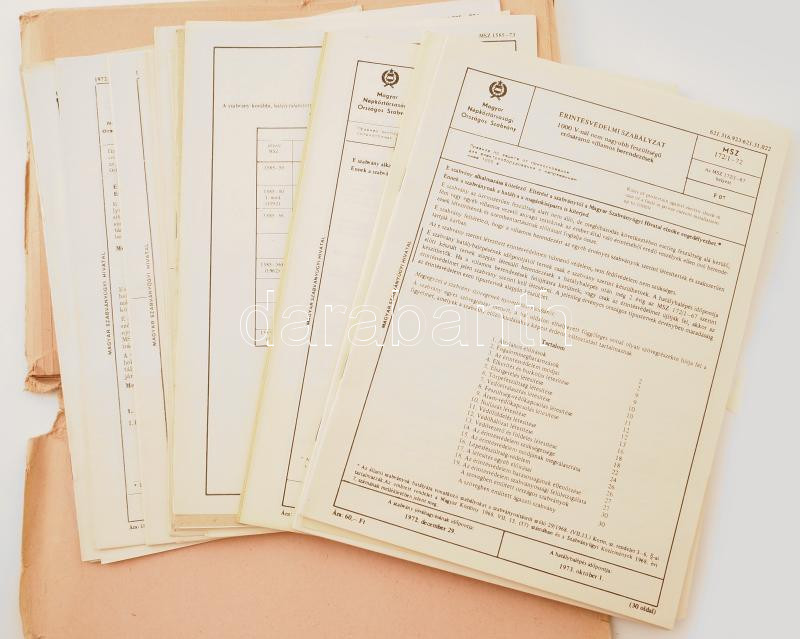 cca 1972-1973 Magyar Népköztársasági Országos Szabványok: nagyfeszültségű, erősáramú berendezések, érintésvédelmi szabályzatok, stb.; összesen kb. 20 db, mappában