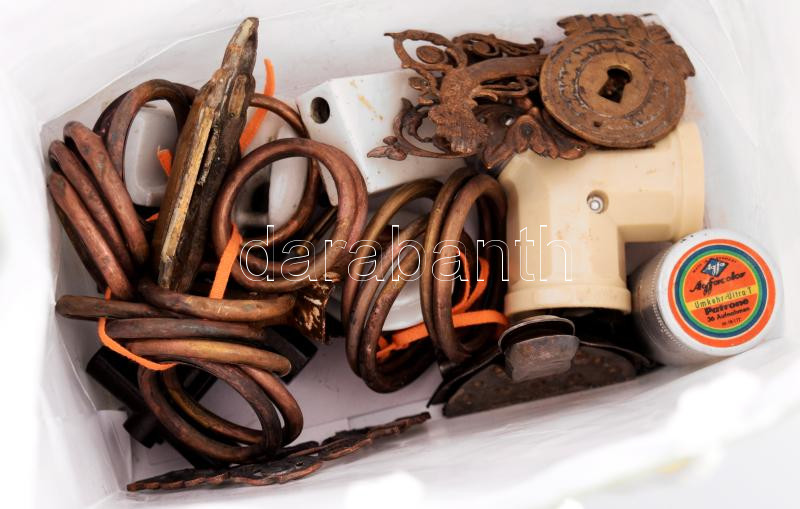 Vegyes érdekes bolha tétel, közte antik figurális bútorveret, 1941 Ebvédjegy, antik citromnyomó, porcelán elektronikai szerelékek, réz karniskarikák, stb.