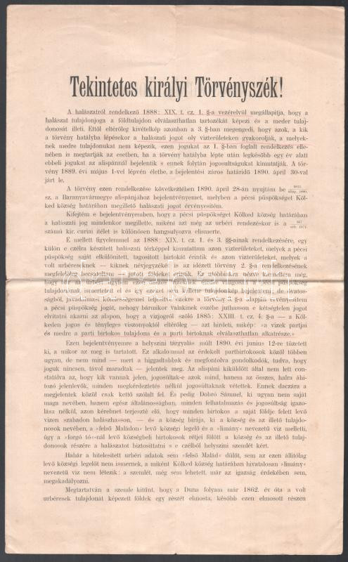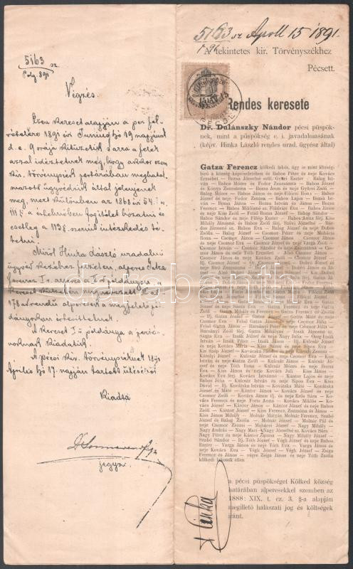 1891 Dr. Dulánszky Nándor pécsi püspök a pécsi kir. törvényszékhez benyújtott keresete halászati jogok tárgyában, 4 oldal, 15kr okmánybélyeggel, a lap tetején kisebb szakadással