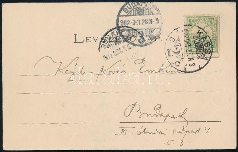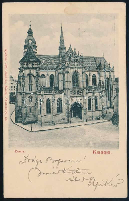 Beschreibung: 1902 Kézdi-Kovács László (1864-1942) festőművész, műkritikus autográf sorai a kassai dómot megörökítő, családjának küldött képeslapon: "Drága bogaram! Imádkoztam érted. Apikád".