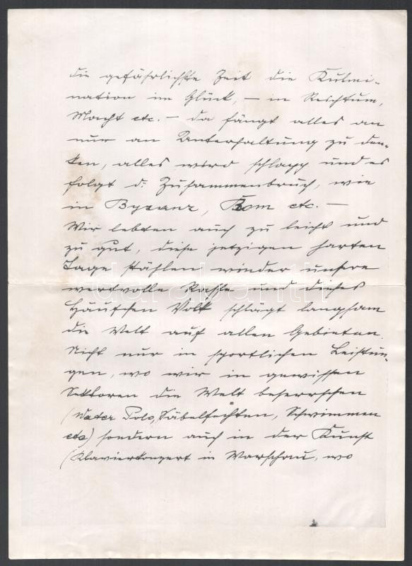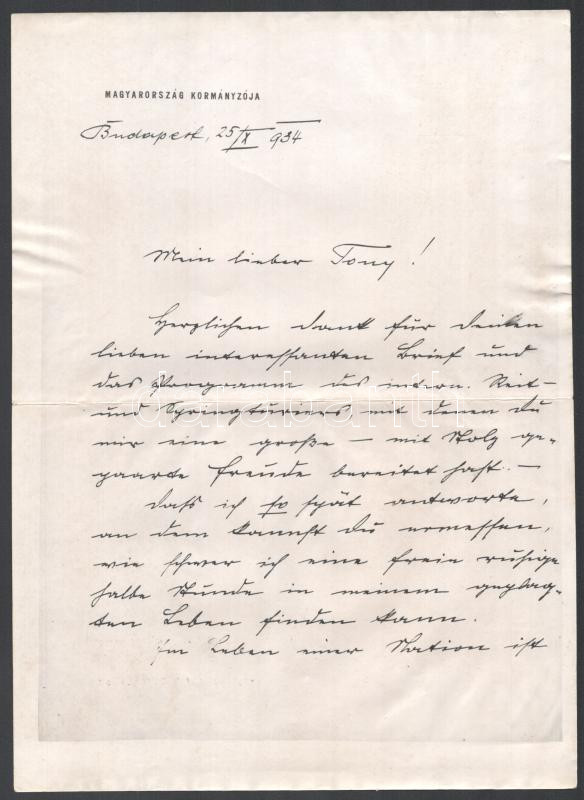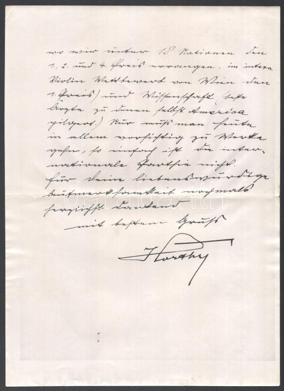 1934.X.25, Bp., Horthy Miklós kormányzó saját kézzel írt leveléről készült régebbi fénymásolat, német nyelven. "Mein lieber Tony!" megszólítással, feltehetően részben sport témában, második oldalon water polo (vízilabda) említésével. 3 beírt oldal, fejléces papíron, egészen apró szakadásokkal, hajtásnyommal.