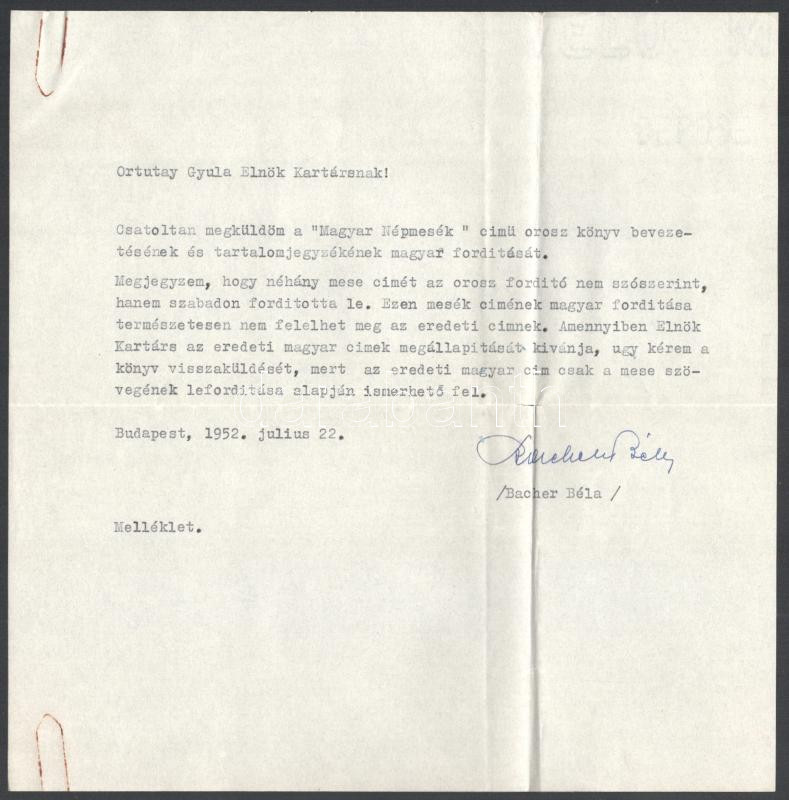 1952 Bacher Béla (1890-1960) művészettörténész gépelt levele, autográf aláírással, Ortutay Gyula (1910-1978) néprajzkutató, politikus részére, "Magyar Népmesék" c. kiadvány ügyében, az egyik oldal sérült, 3 gépelt oldal.