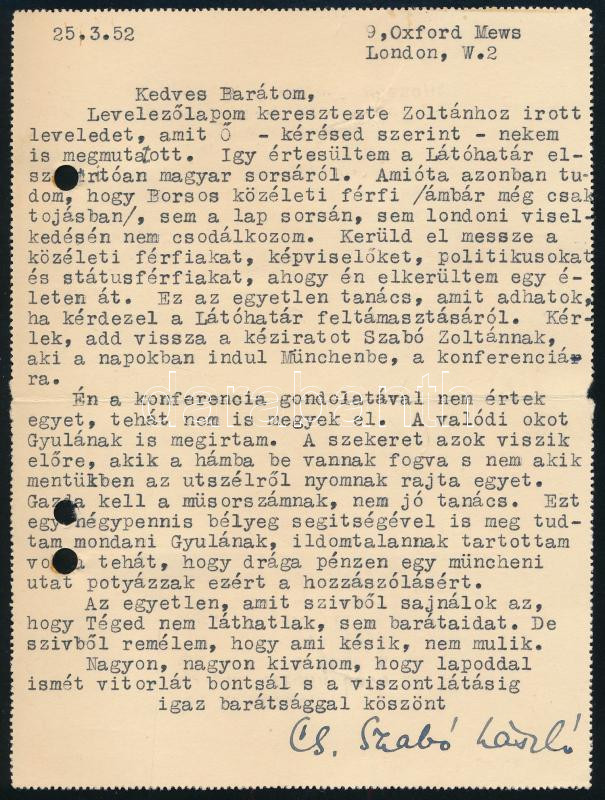 1952 London, Cs. Szabó László (1905-1984) Kossuth-díjas magyar író, esszéíró, kritikus gépelt levelezőlapja, autográf aláírással Vámos Imre (1927-1993) író, újságíró, parasztpárti politikus, a Látóhatár című folyóirat alapító szerkesztője, a Szabad Európa Rádió munkatársának részére, az újjá alakult Látóhatár (Új Látóhatár) folyóirat ügyében.