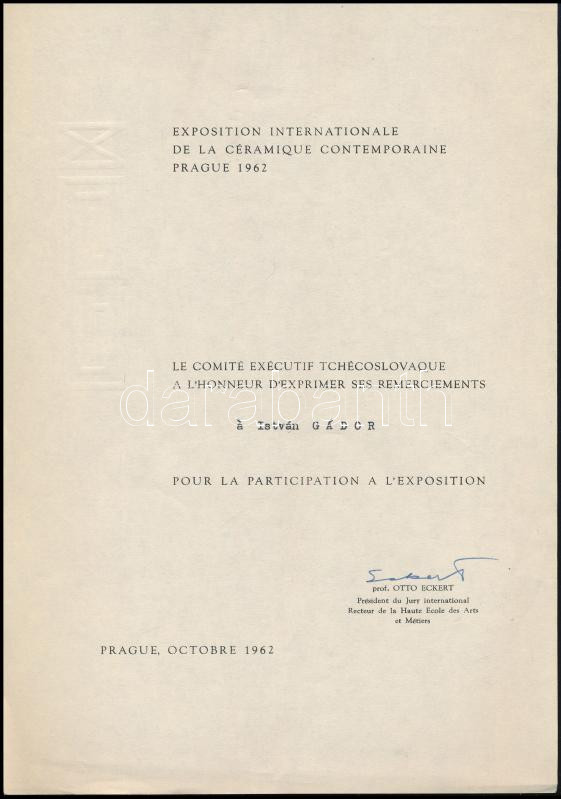 1962 Gádor István (1891-1984) részére szóló köszönetnyilvánító oklevél a prágai Nemzetközi Modern Kerámia Kiállításon (Exposition Internationale de la Céramique Contemporaine Prague 1962) való részvételért, Professzor Otto Eckert (1910-1995) aláírásával.