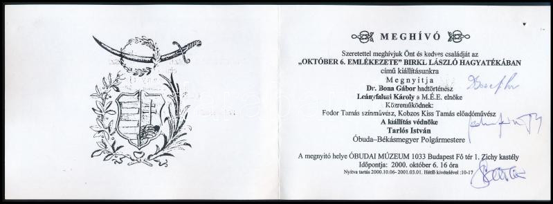 2000 Meghívó "Október 6. Emlékezete" Birkl László hagyatékában c. kiállításra, a meghívón Bona Gábor hadtörténésznek, Leányfalusi Károly Magyar Éremgyűjtők Egyesülete elnökének, és Tarlós István óbudai (majd később Budapest főpolgármesterének) aláírásaival. + 1994 Birkl László Kosstuh-kiállításának fotójával, rajta Tarlós Istvánnal, 9x13 cm