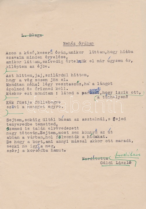 Gáldi László (1910-1974) nyelvész, irodalomtörténész, műfordító Lucian Blaga (1895-1961) román költő ,,Nehéz órában" című költeményéről készített műfordításának géppel írott, egy oldal terjedelmű, saját kézzel javított eredeti kézirata. Kelt: Budapest, 1964 körül. Egyetlen levél, mérete: 203x145 mm, 22 sor. Lucian Blaga (1895-1961) a XX. század egyik legjelentősebb román gondolkodója, változatos élete során újságíró, költő, drámaíró, diplomata, egyetemi tanár és kultúraszervező, 1948 után könyvtáros és műfordító volt. Élete során hét verseskötete jelent meg, de 1948 után hallgatásra ítélték, az utolsó két évtized (1943-1961) versei csak halála után jelentek meg. Az expressszionista szabadversekkel induló Lucian Blaga hamar utat talált a mély gondolati tartalmakhoz és a kötött formákhoz, egyszersmind a román-magyar-szász együttélést szorgalmazó Blaga jelentőségét hamar felismerték a transzilvánista erdélyi magyar költők: méltatása és fordítása már az 1930-as években megkezdődött - Dsida Jenő, Áprily Lajos, Szemlér Ferenc tolmácsolta sok versét. Első reprezentatív verseskötete magyarul az 1960-as évek derekán, a román-magyar kulturális kapcsolatok kedvező idejében, az Európa Könyvkiadónál jelent meg, melybe a költő életében megjelent hét verseskötet válogatott versei mellett a hallgatásra ítélt korszak (1948-1961) költeményei is bekerültek. A ,,Mágikus virradat" címen megjelenő Blaga-versválogatás Domokos Sámuel válogatásában és előszavával jelent meg (Budapest, 1966). Áprily, Jékely Zoltán és Szemlér fordításai mellett Baranyi Ferenc és a jeles romanista Gáldi László fordította a versek zömét, Gáldi László nyelvész az érett (és hallgatásra ítélt) Blaga költeményei közül fordított. Tételünk, a ,,Nehéz órában" című költemény a gyűjtemény 378. oldalán jelent meg. A levél hátoldalán Gáldi László sorszámlálásai, feltehetően a versfordításért járó honorárium megállapításához. Jó állapotú lap.