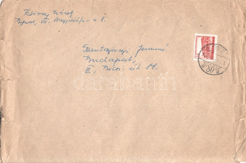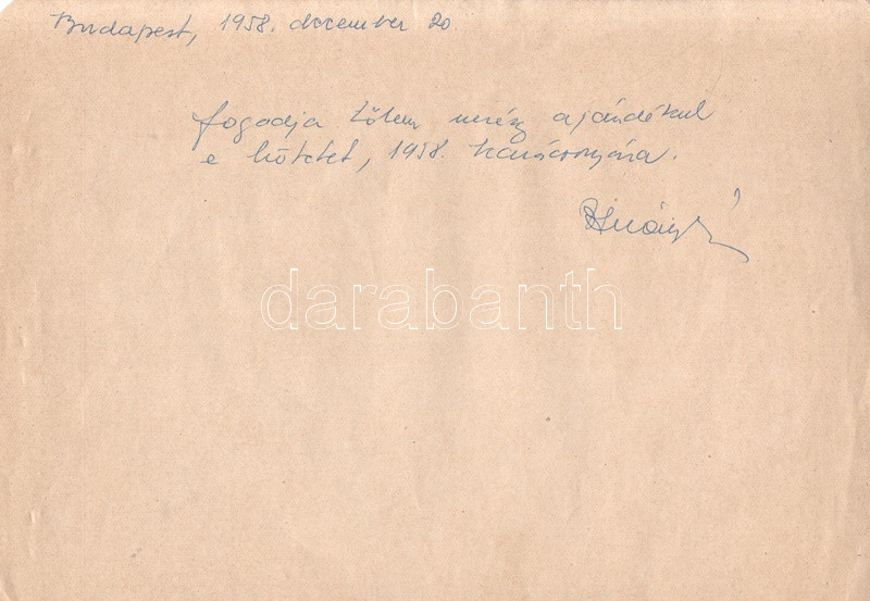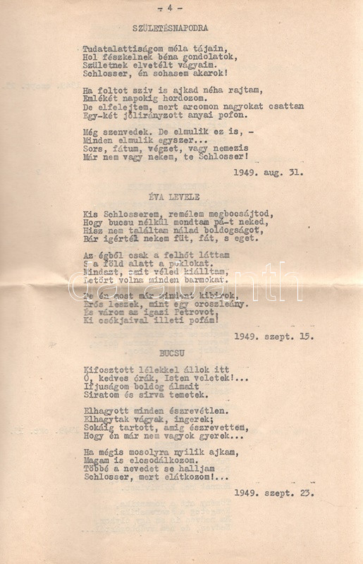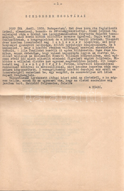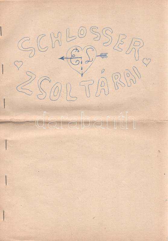 Schlosser zsoltárai. Popp Éva munkahelyi helyzetdalai. Gépirat (1958) Kelt: Budapest, 1958. 14 gépelt oldal, mérete: 297x210 mm. Publikálatlan kéziratunk feltehetően többszörös fikcióként értelmezhető. A címoldalon átlőtt szív rajzolt motívuma körül tollal készült címfelirat. Az Ady Endre szerelmi költészetét parodizáló munkahelyi szerelmi dalok a bevezetésben írtak szerint Popp Éva költőnő, titkárnő művei, melyek az 1949-ben létesített, valóban létező Élelmezési Nemzeti Vállalat központi irodájában keletkeztek, és a költőnő szerelmi viszonyait tárgyalják szerelmi partnereihez, név szerint Schlosser Lászlóhoz, illetve később Szentgyörgyi Ferenc költői lelkületű könyvelőhöz. A dátumozás szerint a költemények 1949. június 30. és 1950 tavasza (Schlosser-zsoltárok), illetve 1950. május 12. és 1951. július 14. között keletkeztek (Szentgyörgyi-dalok). Valamennyi költemény alatt dátumozás, a kötet végén tartalomjegyzék. Egy költemény szövegében kézi korrektúra. A tűzött verseskötethez kézzel írott kísérőlevél tartozik, a kötet és a kísérőlevél kézzel címzett, postabélyegzett levélborítékban. A kísérőlevél szövege: ,,Fogadja tőlem szerény ajándékul a kötetet, 1958. karácsonyára. Zsiray Károly". A levél feladója - és feltehetően a költemények valódi szerzője - Zsiray Károly, címzettje Szentgyörgyi Ferencné. Jó állapotú lapok, tűzve, illetve jó állapotú levél, enyhén sérült borítékban.