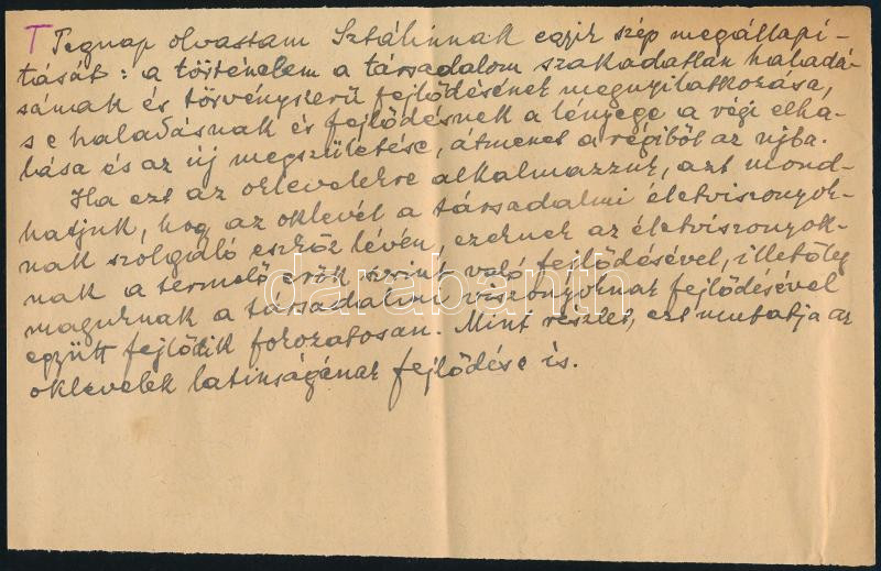 Beschreibung: Szentpétery Imre (történész, 1878-1950) autográf feljegyzése az oklevéltan és Sztálin gondolatának összefüggéséről.