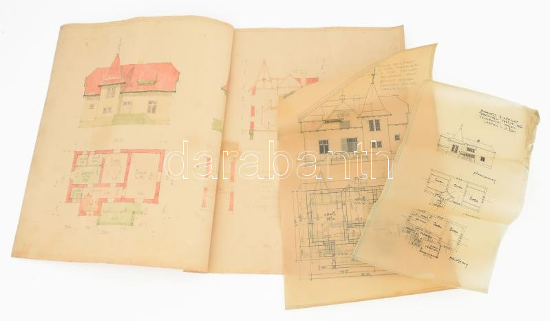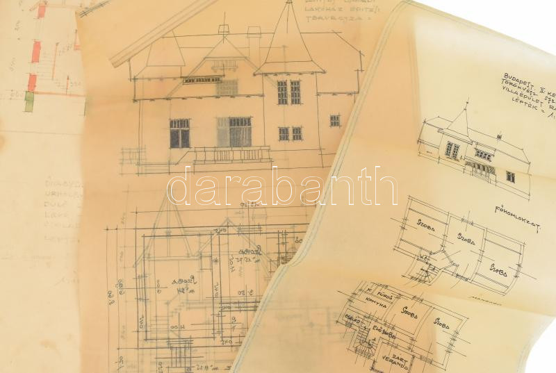 cca 1910 őnagysága Raab Erszébet Bp., II. Törökvész dűlő (ma Búzavirág utca) 5726/2 hrsz alatt építendő családi lakóház 3 db tervrajza. Kézzel rajzolt 62x37 cm-ig