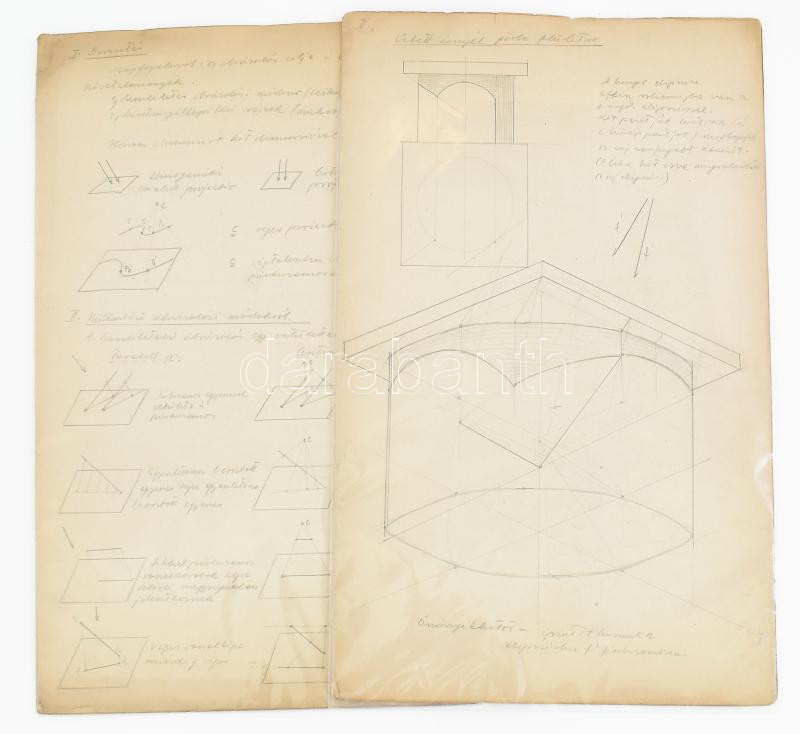 cca 1950 Kriegler Erzsébet (1929-) későbbi építész 2 db jegyzete, ábrázoló geometria. Kb. 25-30 beírt és rajzolt lap