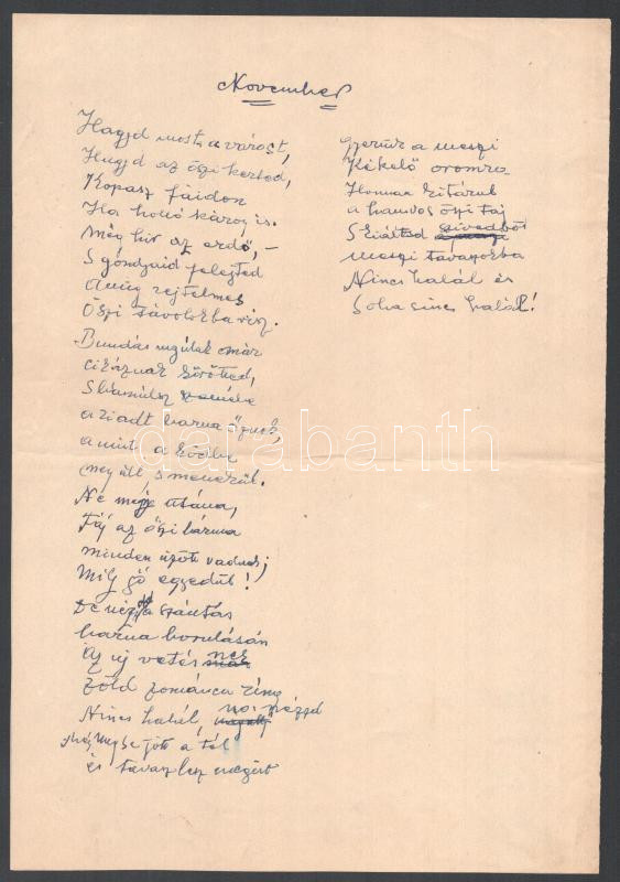 cca 1957 Dutka Ákos (1881-1972) költő, író saját kézzel írt, "Nov... https://www.darabanth.com/de/472-Fernauktion/472.0/Kunst-Dokumente-andere-Sammelgebiete/Historische-Dokumenten-Handschriften~1000022/cca-1957-Dutka-Akos-1881-1972-kolto-iro-sajat-kezzel-irt-November-c-versenek-kezira~II2969077