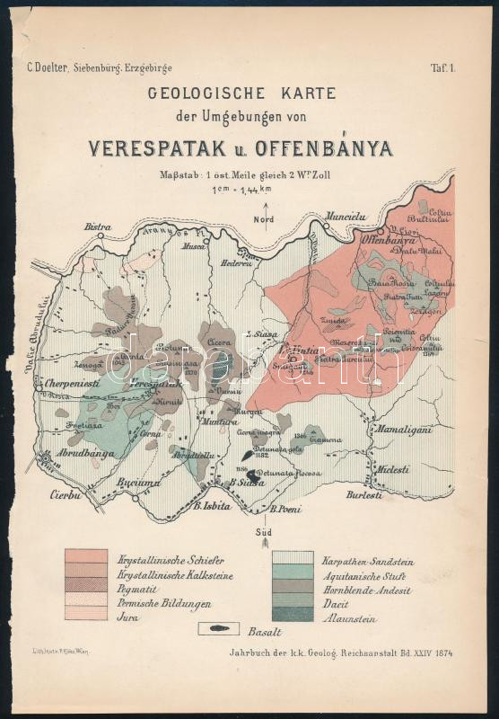 Beschreibung: 1874 Geologische Karte der Umgebungen von Verespatak u. Offenbánya. Jahrbuch der k. k. geologische Reichsanstalt Bd. XXIV, Taf. 1. / Verespatak és Aranyosbánya (Erdély) környékének földtani térképe, szÃnes litográfia, a lap széle kissé sérült, 24,5x16,5 cm