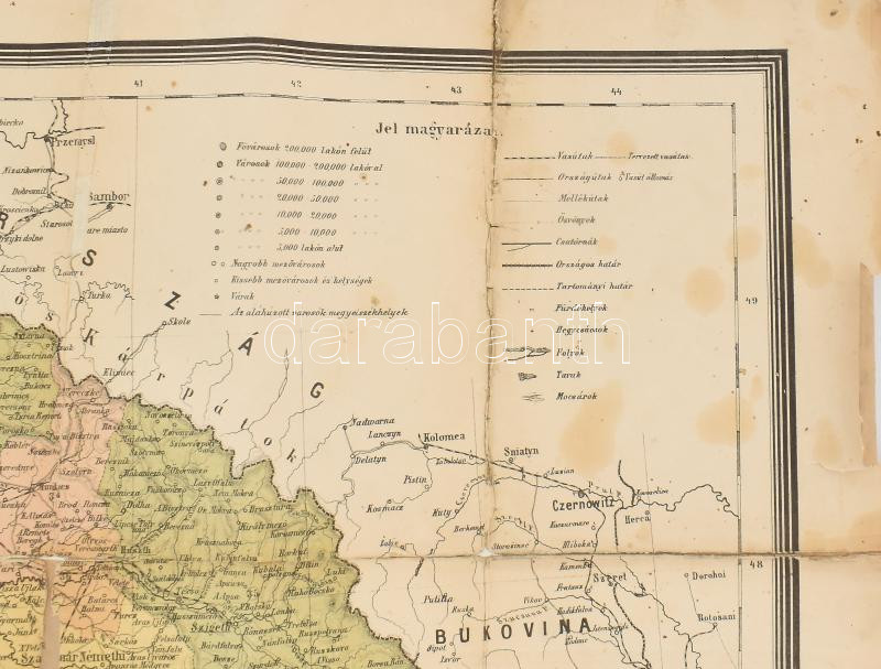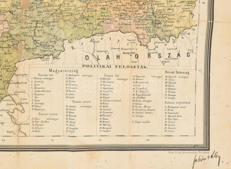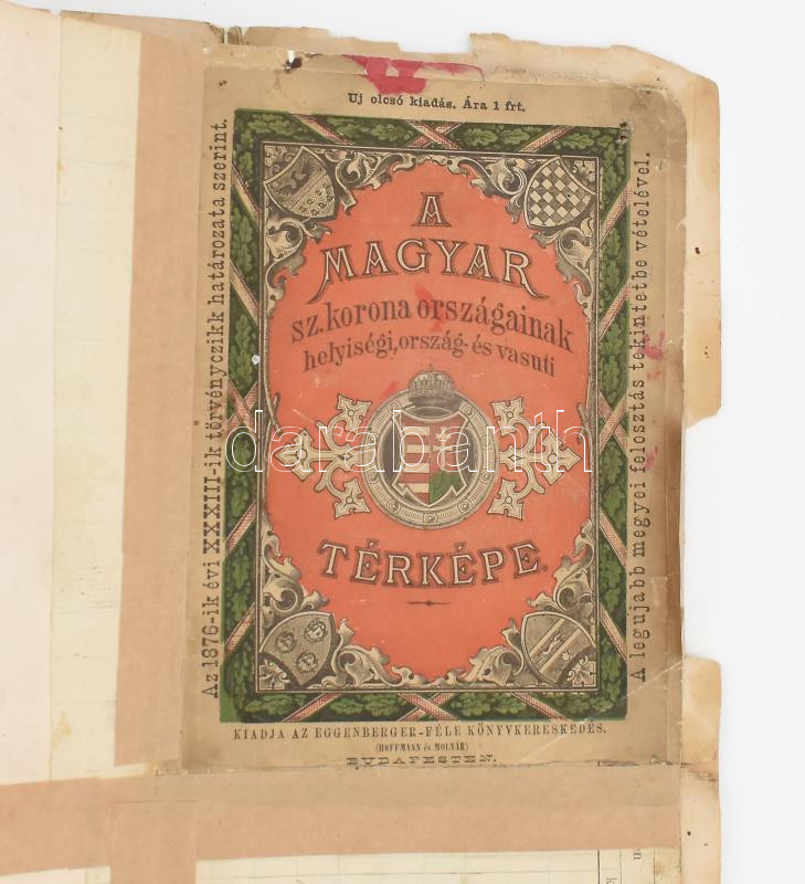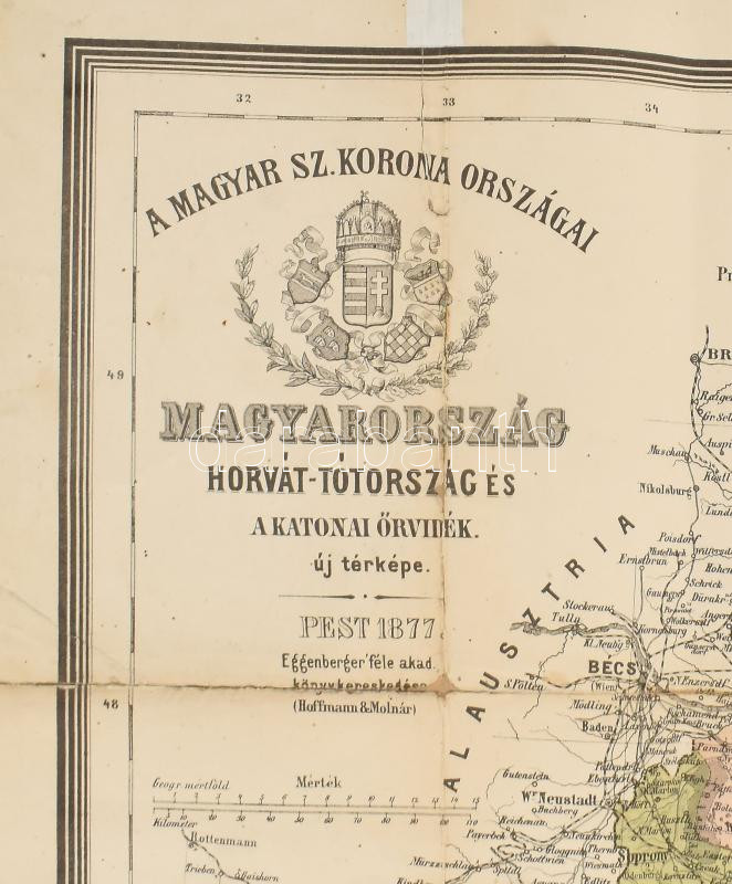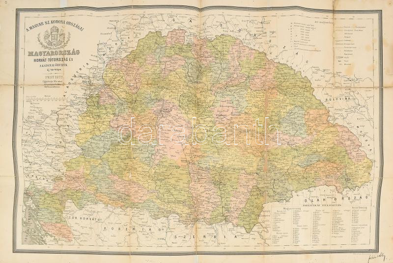 1877 A Magyar Sz. Korona országai Magyarország, Erdély, Horvát-Tótország és a katonai őrvidék új térképe. A hátoldalán papírragasztóval megerősítve, kis beszakadásokkal 54x77 cm