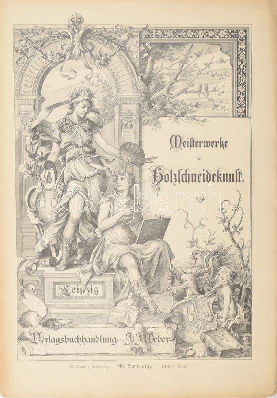 1887 Meisterwerke der Holzschneidekunst. 98. Lieferung. (IX. Band 2. Lieferung). Művészi fametszetekkel illusztrált, német nyelvű kiadvány. Leipzig, J. J. Weber, 8 p.+ 6 (fametszetek, ebből 2 duplaoldalas) t. Kiadói papírkötés, sérült borítóval, fűzés nélkül.