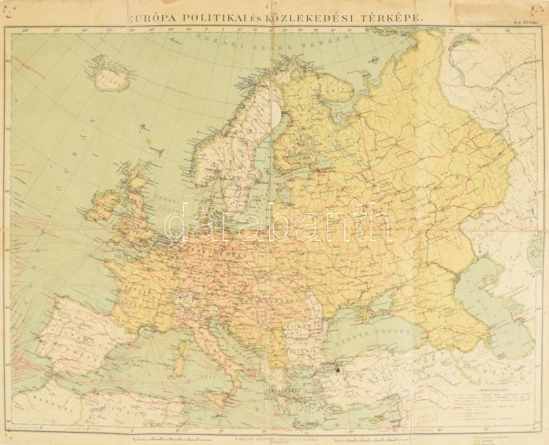 1914 Európa politikai és közlekedési térképe (szövetséges, semleges és ellenséges államok megkülönböztetésével), Bp., Magyar Földrajzi Intézet R.T., kisebb foltokkal, sérülésekkel, javításokkal, 41x51 cm
